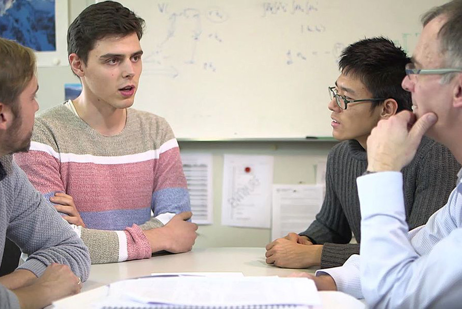 Diskussion von Studierenden und Dozenten während Präsenzphasen des Masterstudiums.